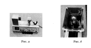 На установке, представленной на фотографиях (рис. а – общий вид, рис.в – фотоэлемент), исследовали зависимость кинетической энергии фотоэлектронов от частоты падающего света. Для этого в прорезь осветителя помещали различные светофильтры. В первой серии опытов использовали светофильтр, пропускающий только синий свет, а во второй – пропускающий только зеленый