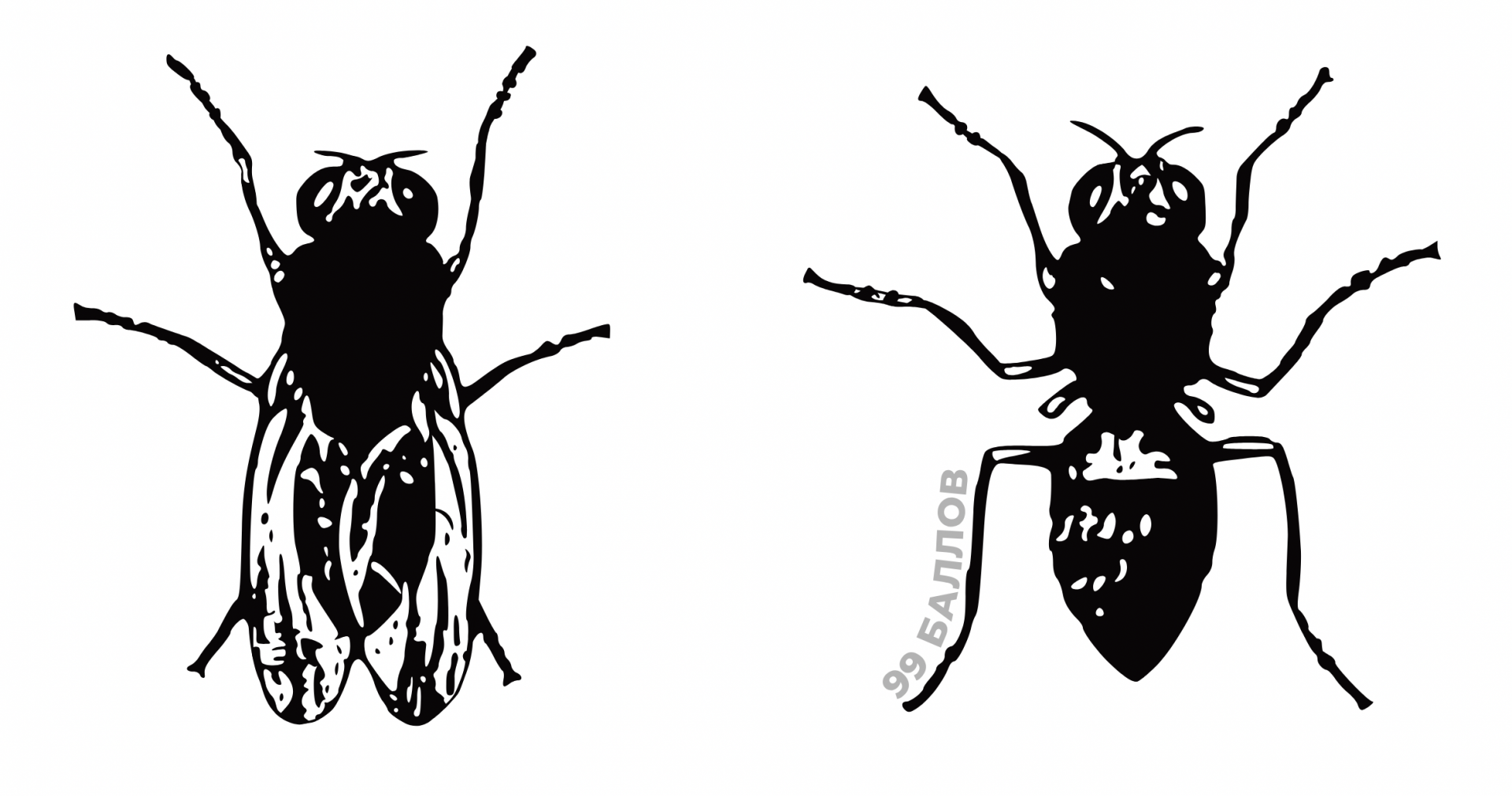 Рассмотрите рисунки с изображением плодовых мушек дрозофил (Drosophila melanogaster), участвовавших в эксперименте, по результатам которого был сформулирован закон. Заполните пустые ячейки таблицы, используя элементы, приведённые в списке.